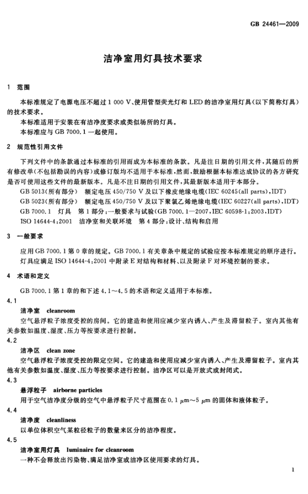 潔凈室用燈具技術要求規范標準 GB24461-2009 (燈具技術要求)